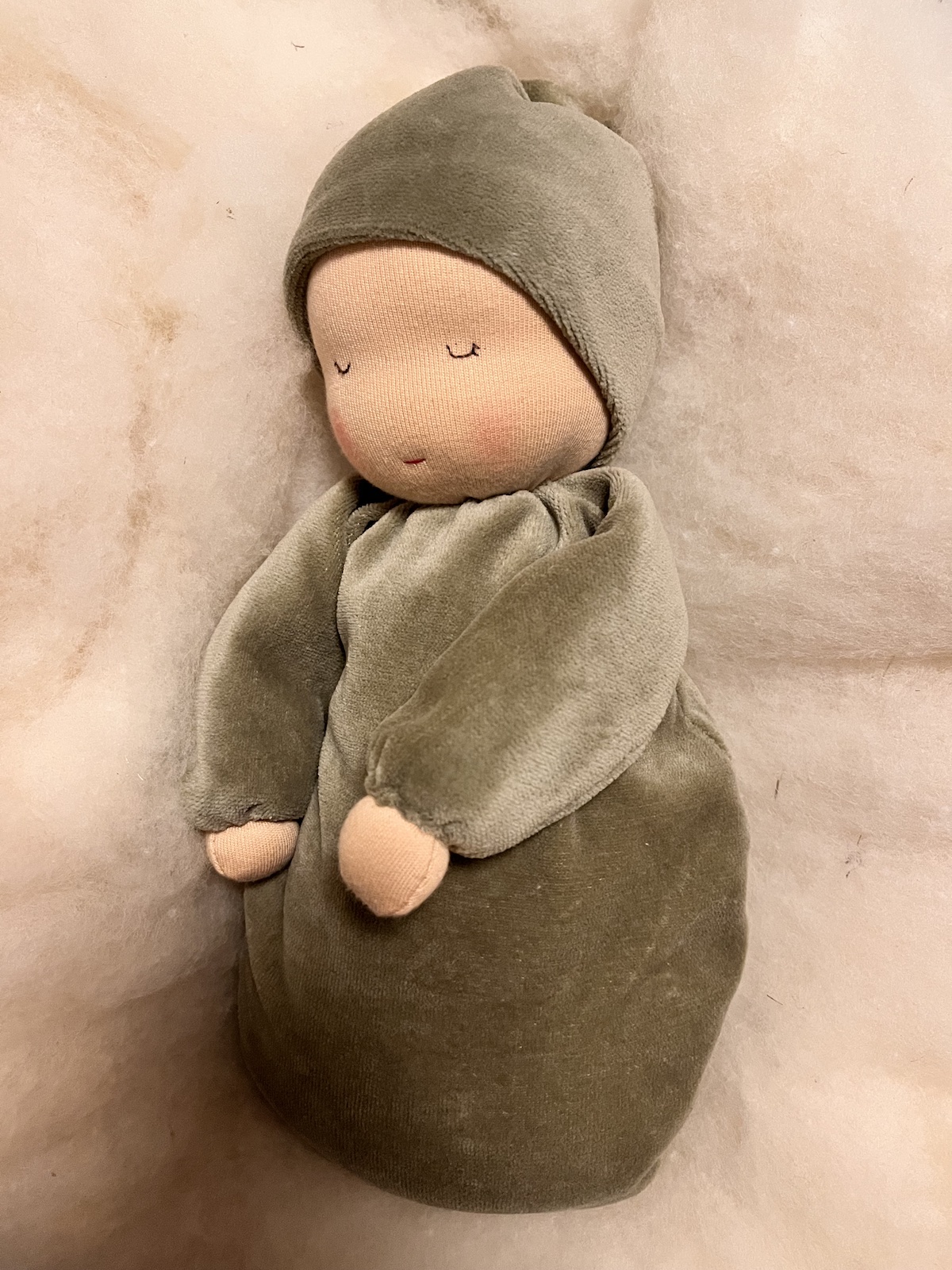 Detta är en waldorfdocka med tyngd. Den har ett yttertyg av milt grön velour och är fylld med ull och hirs. En mjuk bebisdocka som verkar lugnande och terapeutiskt när den hålls i famnen. Tyngden gör att den upplevs som en riktig bebis. Den är ca 30 cm.