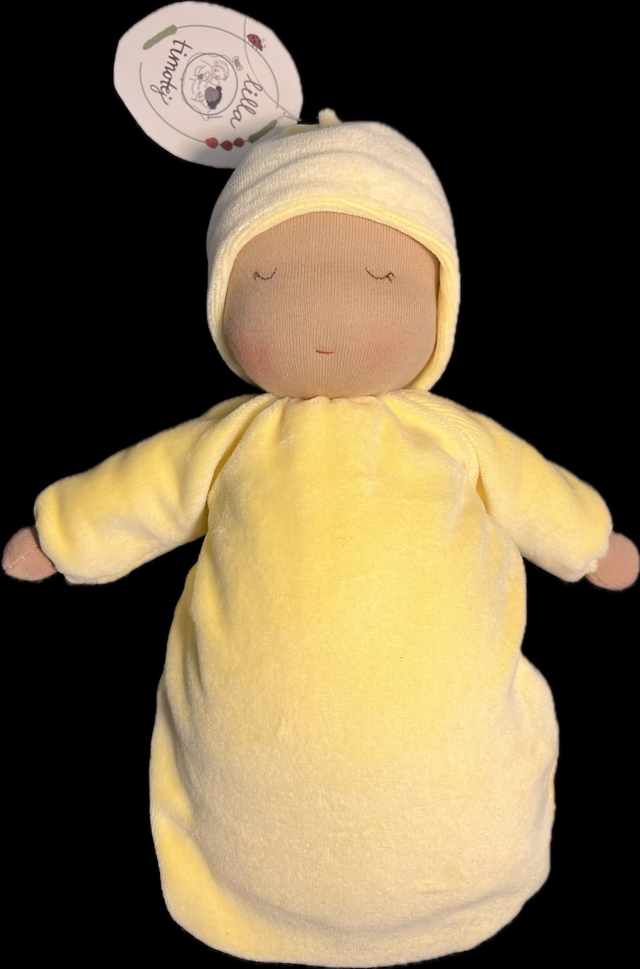 Detta är en waldorfdocka med tyngd. Den har ett yttertyg av ljust gul velour och är fylld med ull och hirs. Hudtyget är i en litet mörkare ton. En mjuk bebisdocka som kan verka lugnande och terapeutiskt när den hålls i famnen. Tyngden gör att den upplevs som en riktig bebis. Den är ca 30…