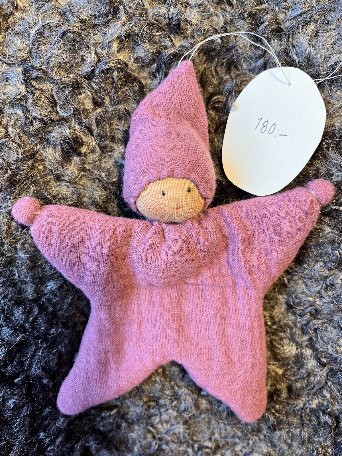 En söt liten docka i form av en stjärna. Sydd i lila bomullsmuslin med ett innerlager av filtad ull. Ca 10 cm.