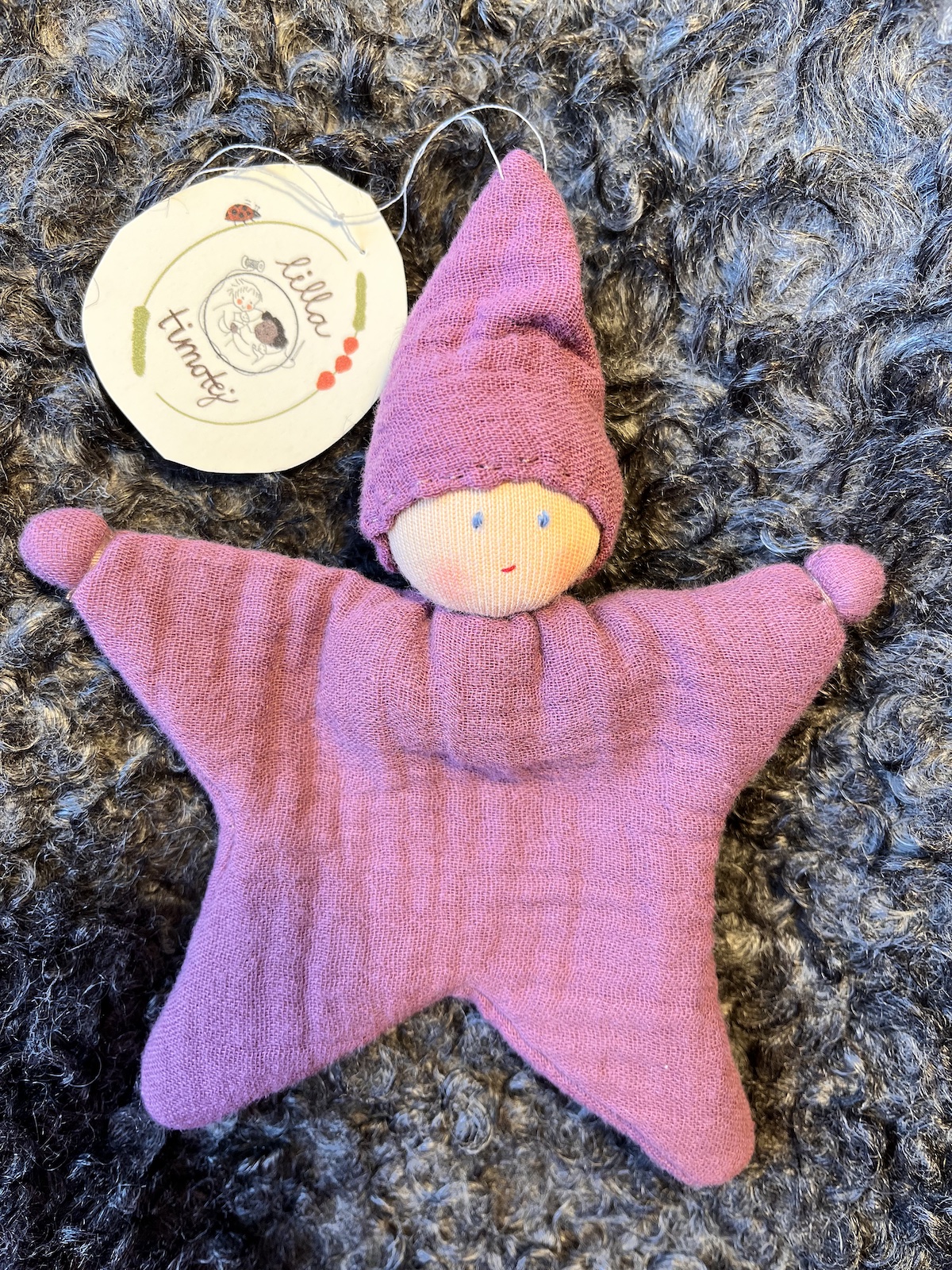 En söt liten docka i form av en stjärna. Sydd i lila bomullsmuslin med ett innerlager av filtad ull. Den är ca 10 cm.